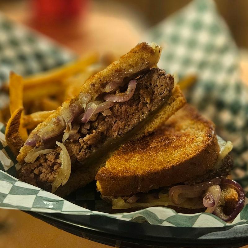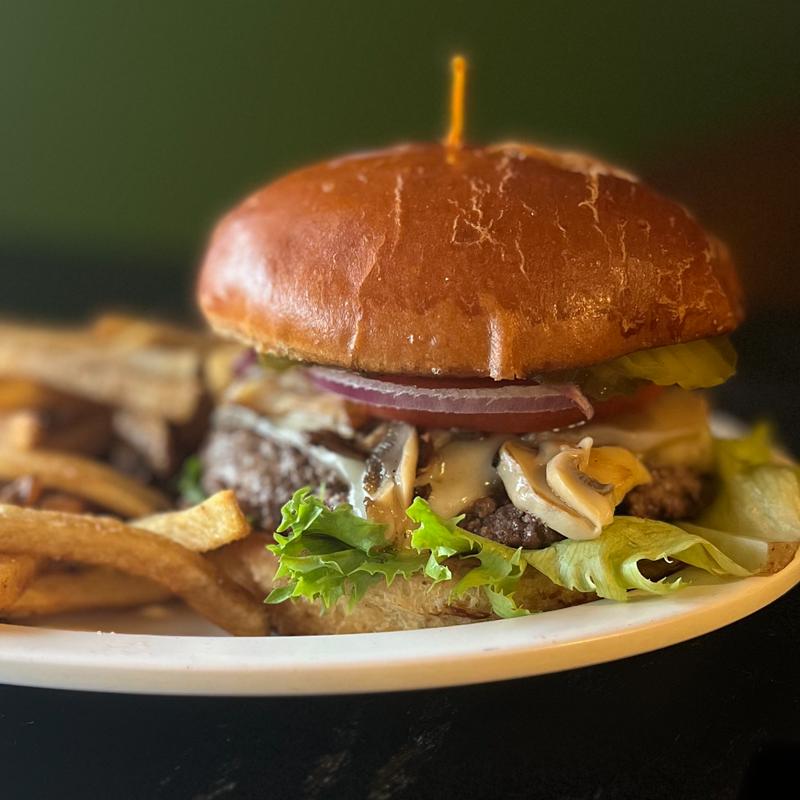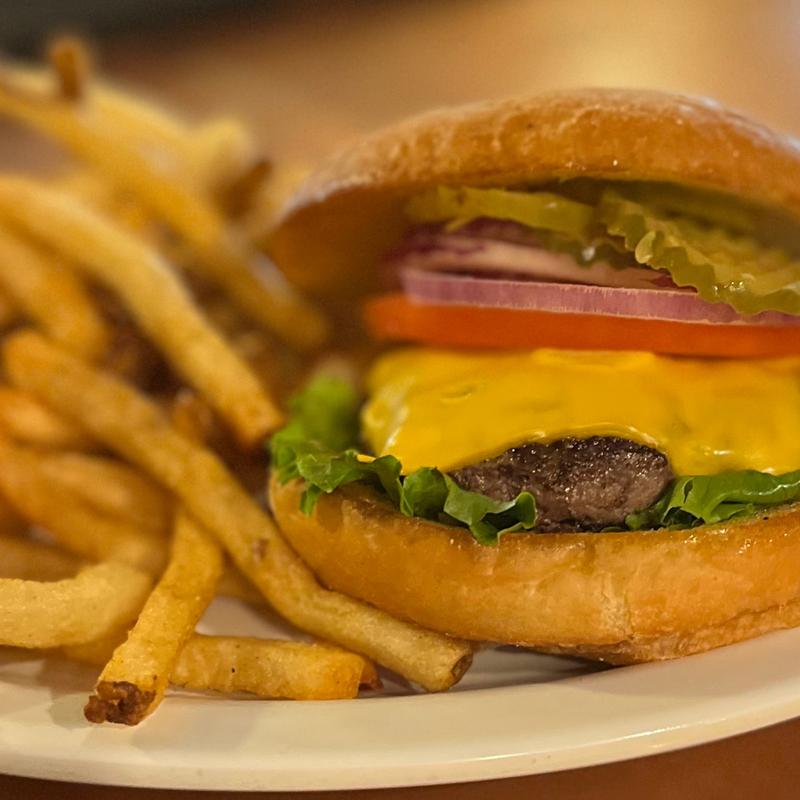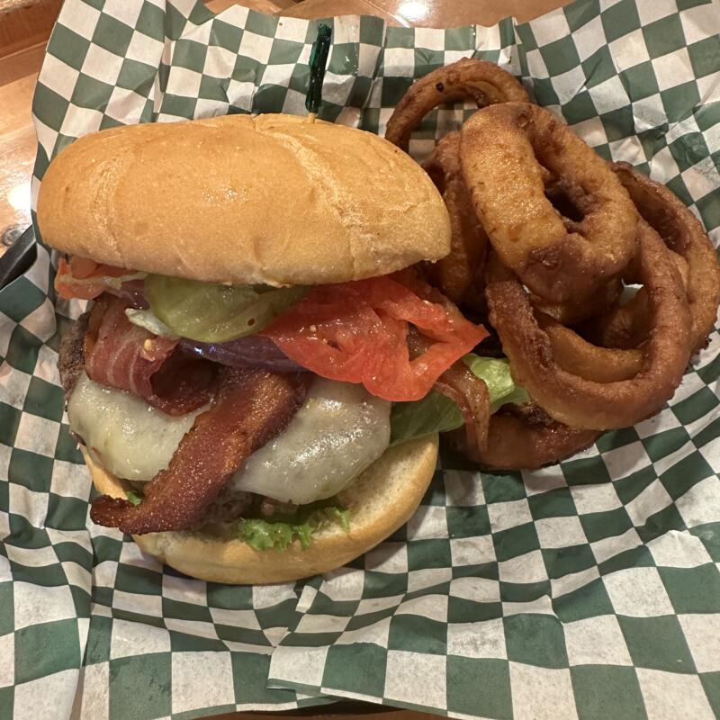7 oz Burger topped with American cheese, bacon, grilled onions, coleslaw, and BBQ sauce. Served with fries.