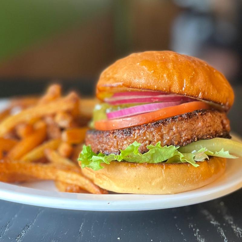 All hand-painted burgers come with Lettuce, Tomato, Onion, and Pickle, served with Fries | Substitute a burger for a chicken breast at no additional charge